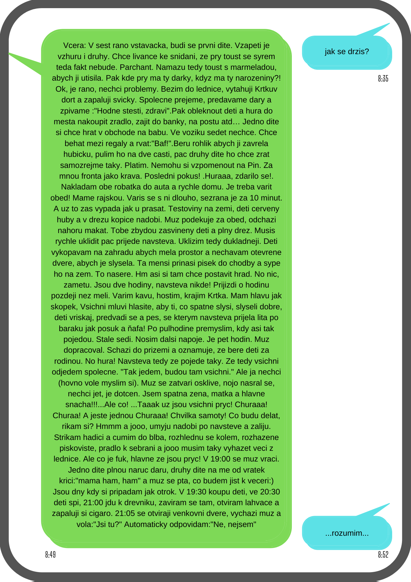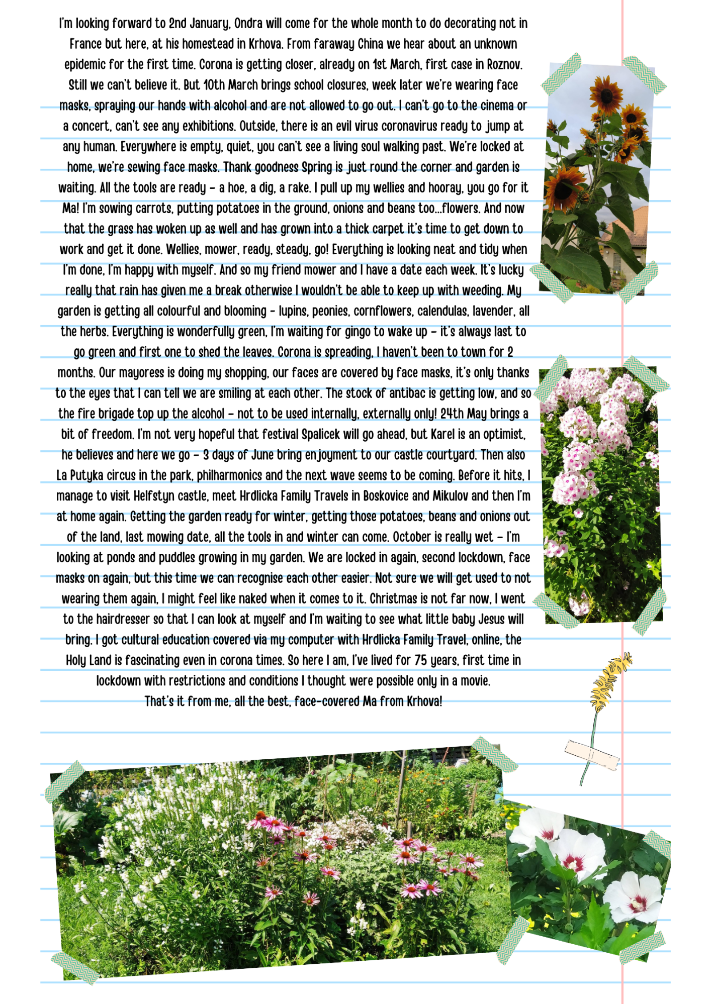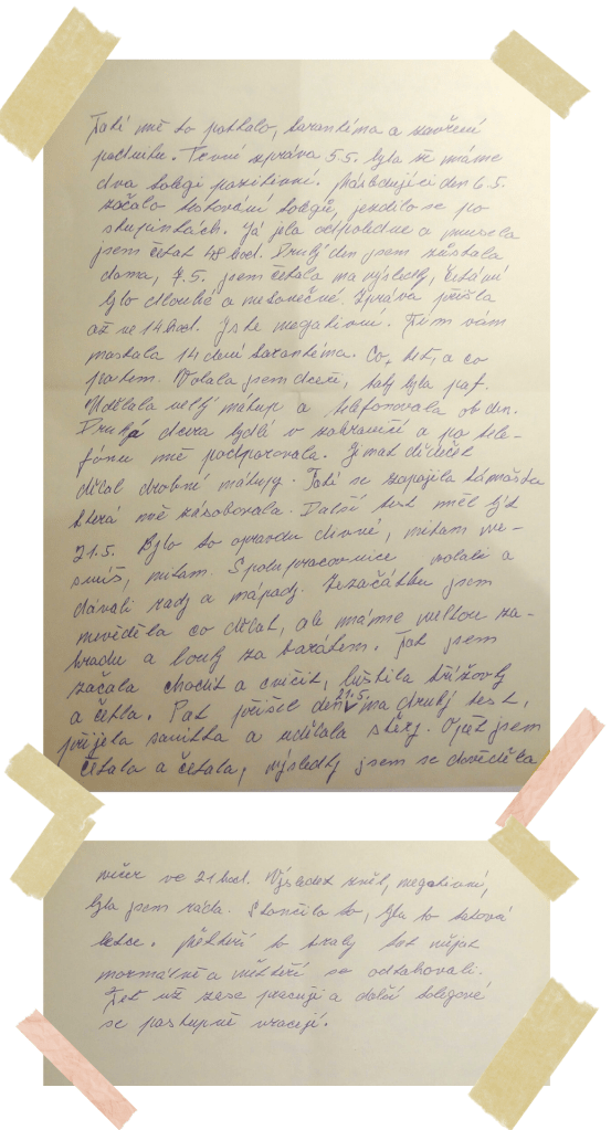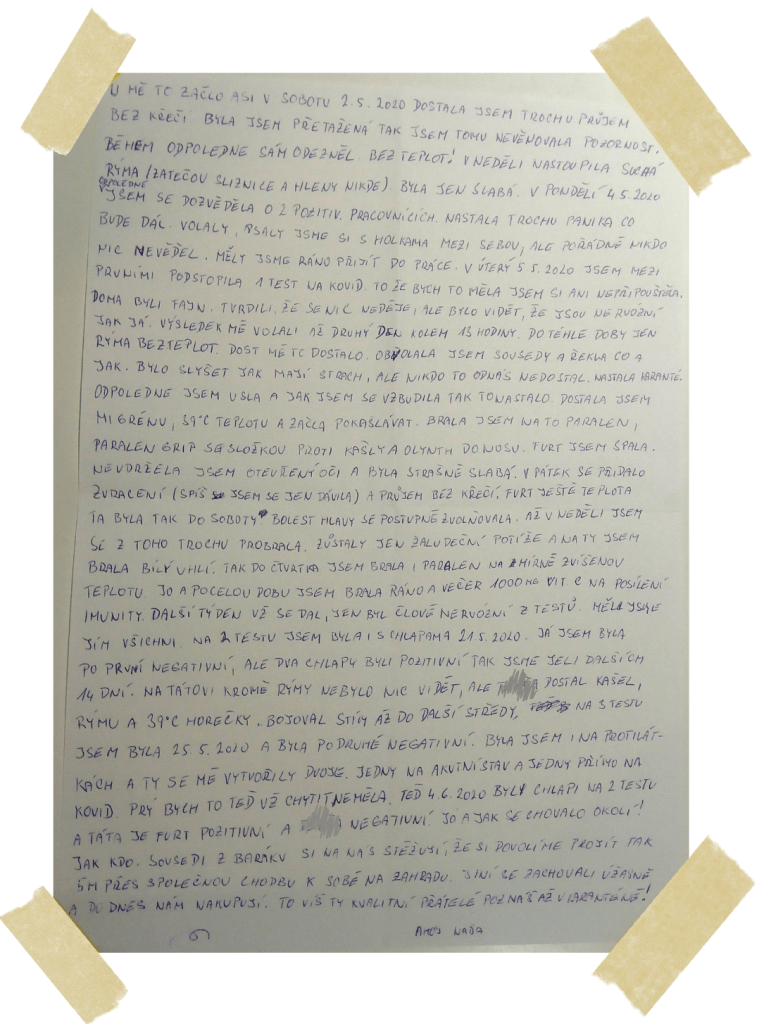 For me, it started on Saturday 2.5. 2020, I got a bit of diarrhoea, without cramps, I was overworked and so I didn’t pay attention to it. It was gone during the afternoon and I did not have fever. On Sunday came ‘dry running nose’ – inside of the nose got inflamed but no phlegm. I was weak. On Monday 4.5. 2020 in the afternoon I heard about two colleagues who were positive. There was a bit of a panic about what would be next. We were phoning each other with the girls but no one really knew much. We were due at work the next morning. On Tuesday 5.5. 2020 I was one of the first people who had the first covid test. I wasn’t thinking about having it. At home, everyone was nice, saying that it was OK but you could see that they were nervous, like me. They called about the result the next day, at about 13.00. Till then I only had a bit of runny nose and no fever. It got me [that I had it] – I called all the neighbours and explained what needed to happen. You could hear that they were afraid but no-one had caught it from us. It was time to quarantine. I fell asleep in the afternoon and when I woke it all started – I got migraine, 39C fever and started to cough. I was taking paralen and paralen grip with anti-cough effect and also olynth for my nose. I was sleeping all the time. I could not keep my eyes open and I was terribly weak. On Friday I started to be sick (though it was more like gagging) and I got the diarrhoea without cramps again. I still had fever, till about Saturday. My headache was gradually easing. Sunday was better. The tummy issues stayed and I was taking activated charcoal. I was taking paralen till Thursday and had a bit of a temperature. Yes and during the whole time I was taking 1000mg of vitamin C in the morning and in the evening for better immunity. The following week was bearable, I was nervous because of the tests though. The whole family was supposed to go and so I had my second test with the lads on 21.5.2020. I was negative after this one but the lads were positive and so we had another two weeks of this. Dad didn’t have anything apart from running nose but my son had cough, runny nose and 39C fever. He was struggling with it till the following Wednesday. My 3rd test was negative. They were also checking for antibodies and I had both – one for the acute illness and one against covid. They said I should not catch it again. Now 4.6.2020 lads went for the second test and dad was still positive. My son was negative. And what about our neighbourhood? Depends. Neighbours from the block of flats were complaining that we dared to enter the 5 metre long common corridor and landing so that we could go into our garden. Some neighbours were brilliant and had been shopping for us. You know, you can tell who’s a good friend when you have to quarantine.